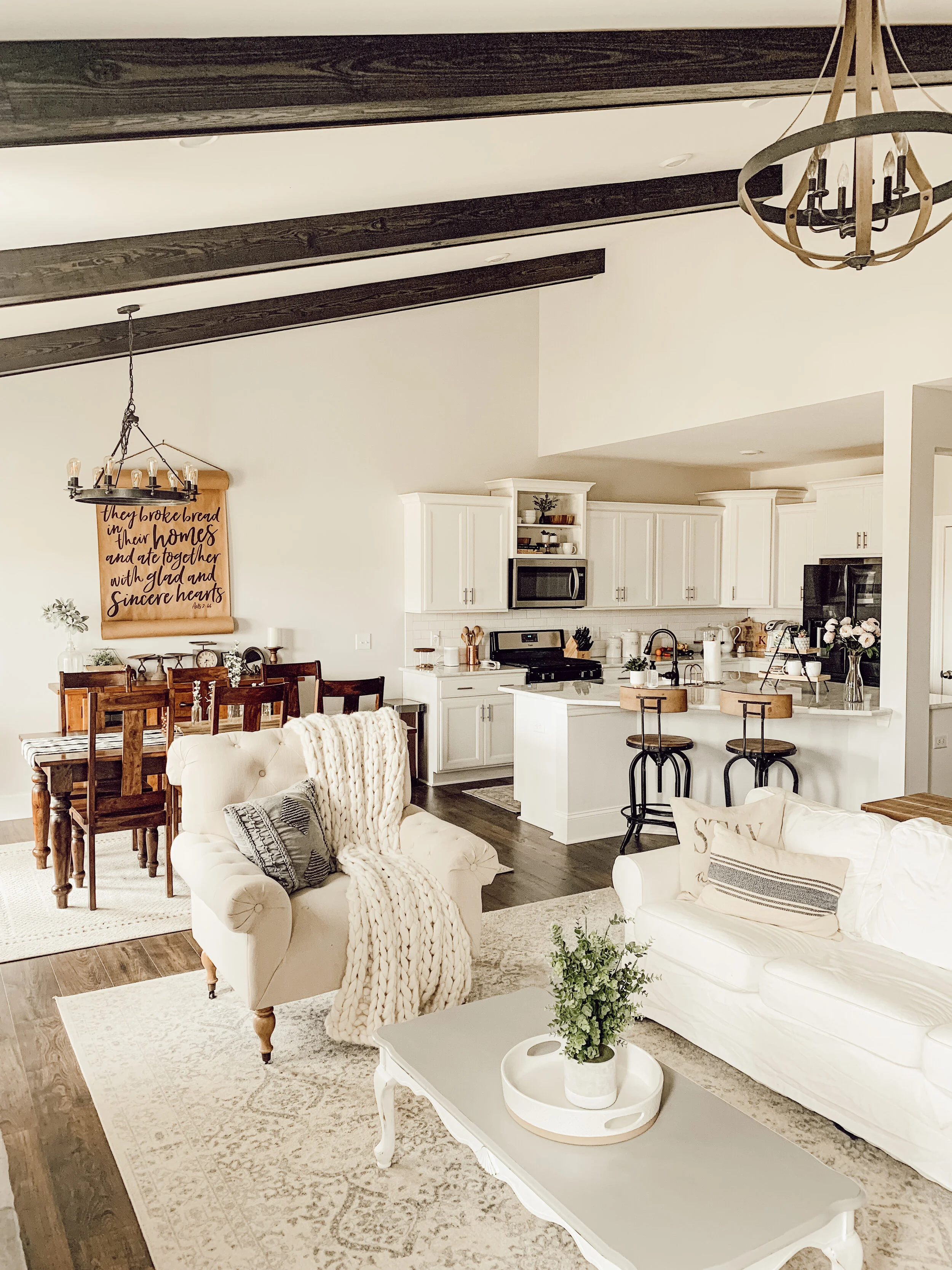 One of the other main selling points of our floor plan is how open the kitchen, dining, and living rooms are. They are essentially one big room, and I love how the space is perfect for hosting and entertaining. I especially loved how big and unique the shape of the kitchen island was. We were able to put barstools at it for additional seating, and we have so much counter space which is great to have. Our mantle and fireplace were other must haves in our home, and I love that we are able to turn the fireplace on and hang stockings on the mantle at Christmas time.